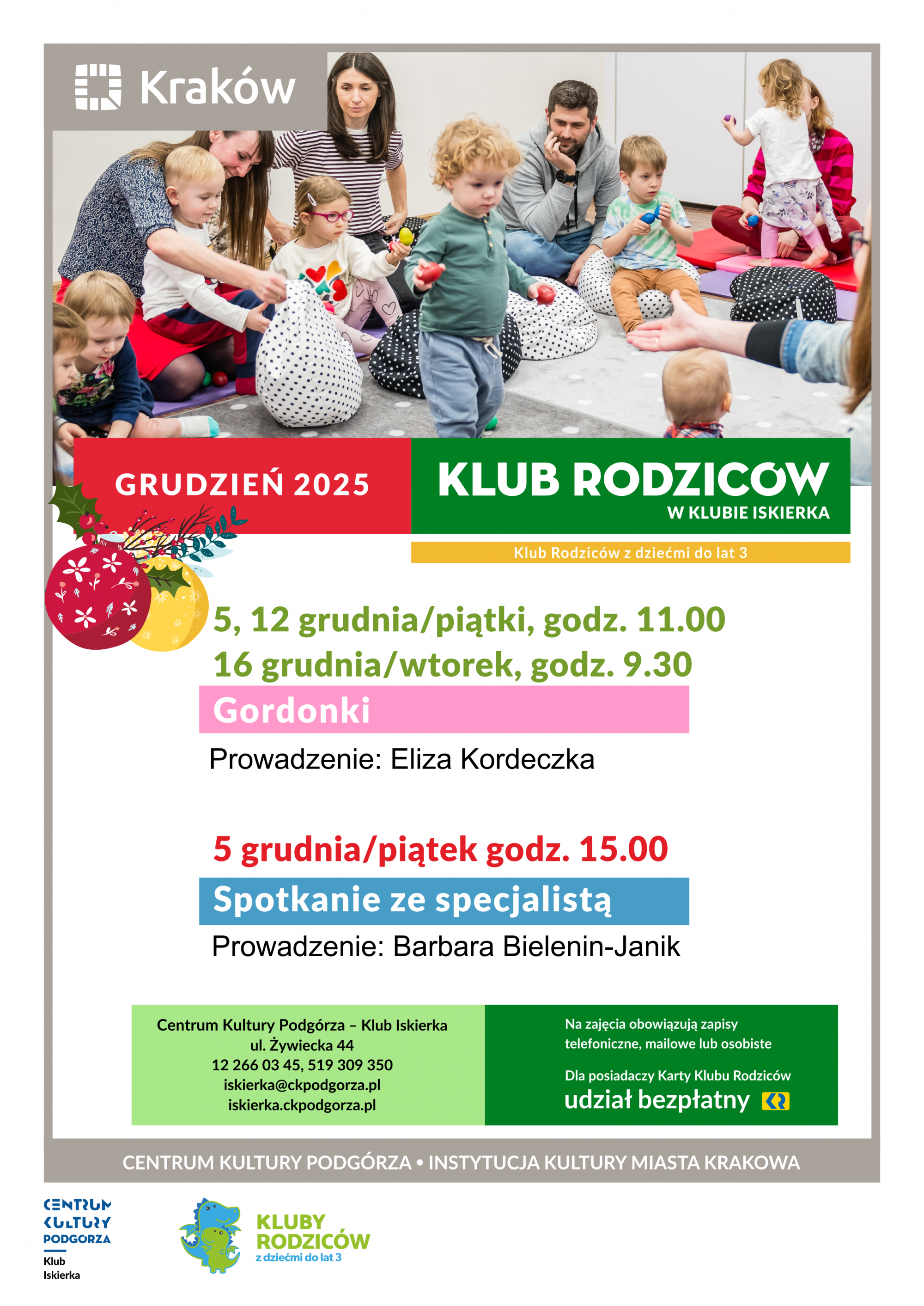 Harmonogram zajęć w Klubie Rodziców Klubu Iskierka w grudniu 2025 r.