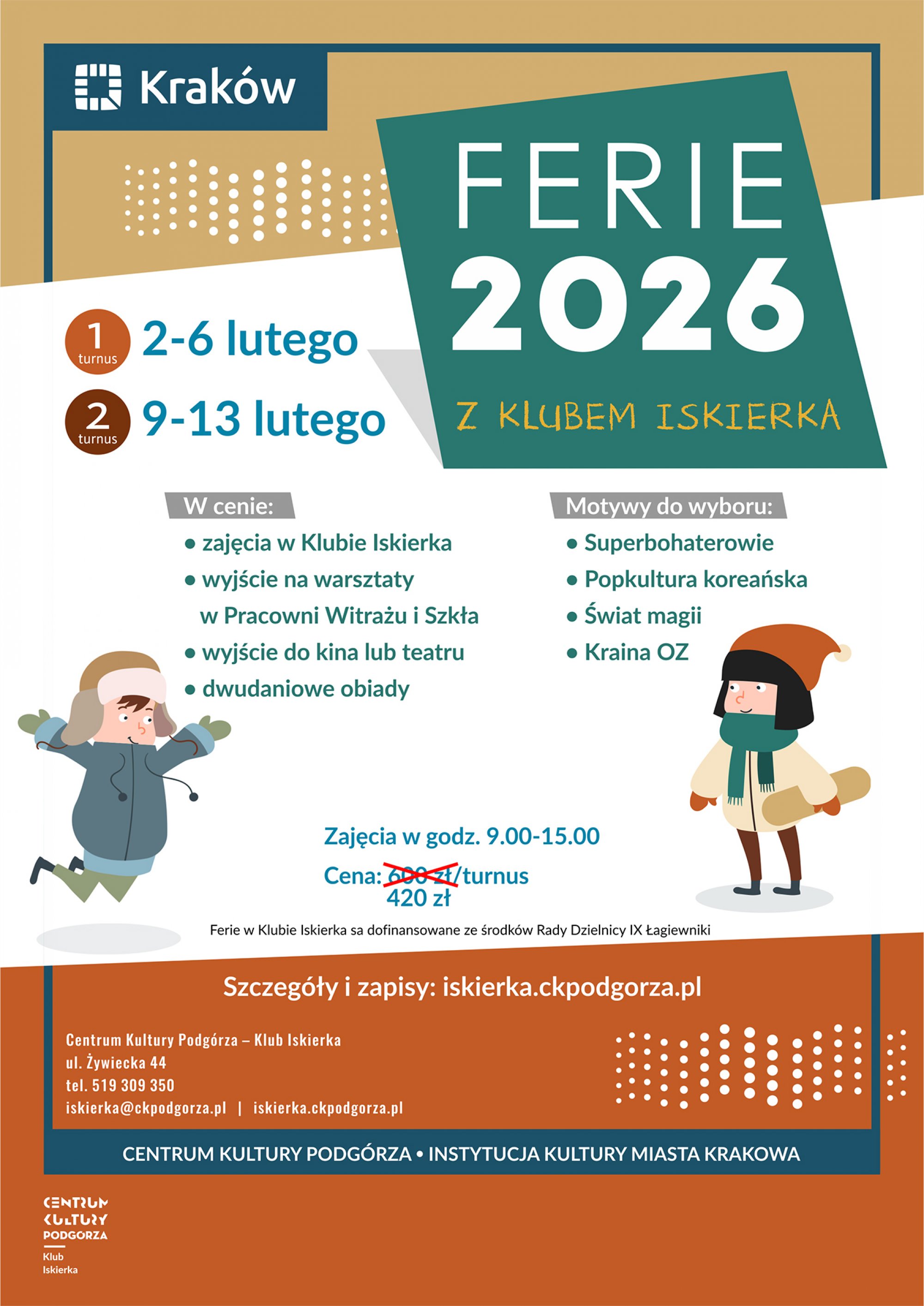 Zapraszamy do Klubu Iskierka na zajęcia i wycieczki organizowane w czasie półkolonii. 02.02.-06.02.2026 r. (I Turnus) 09.02.- 13.02.2026 r. (II Turnus)